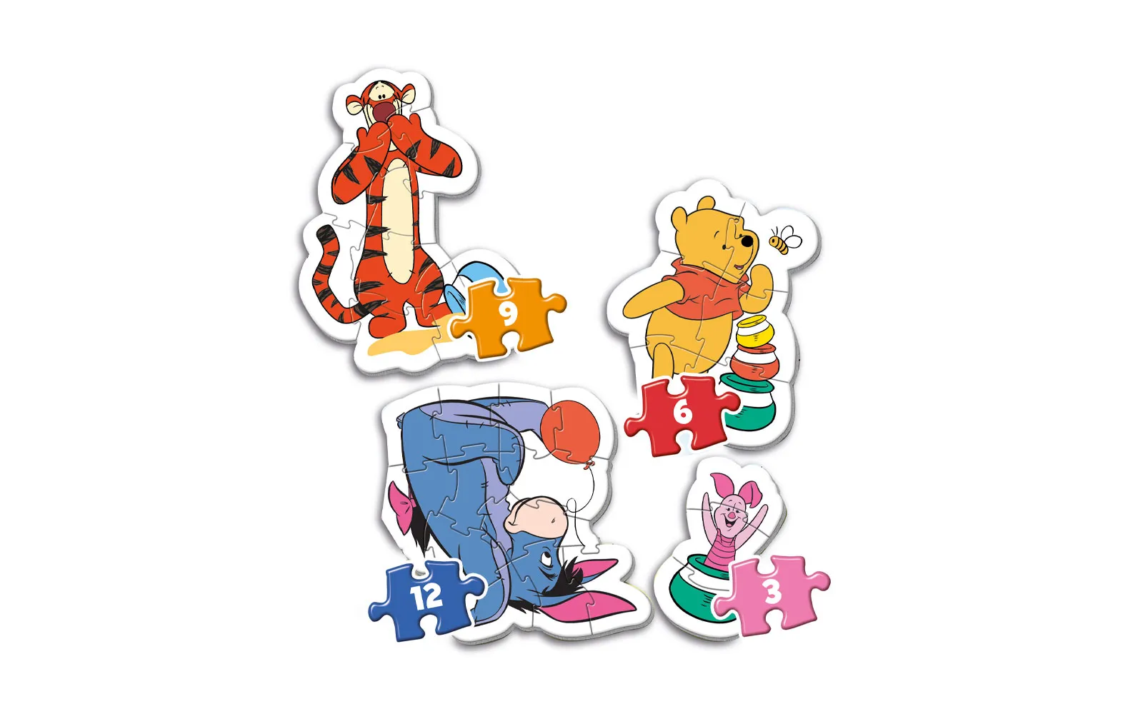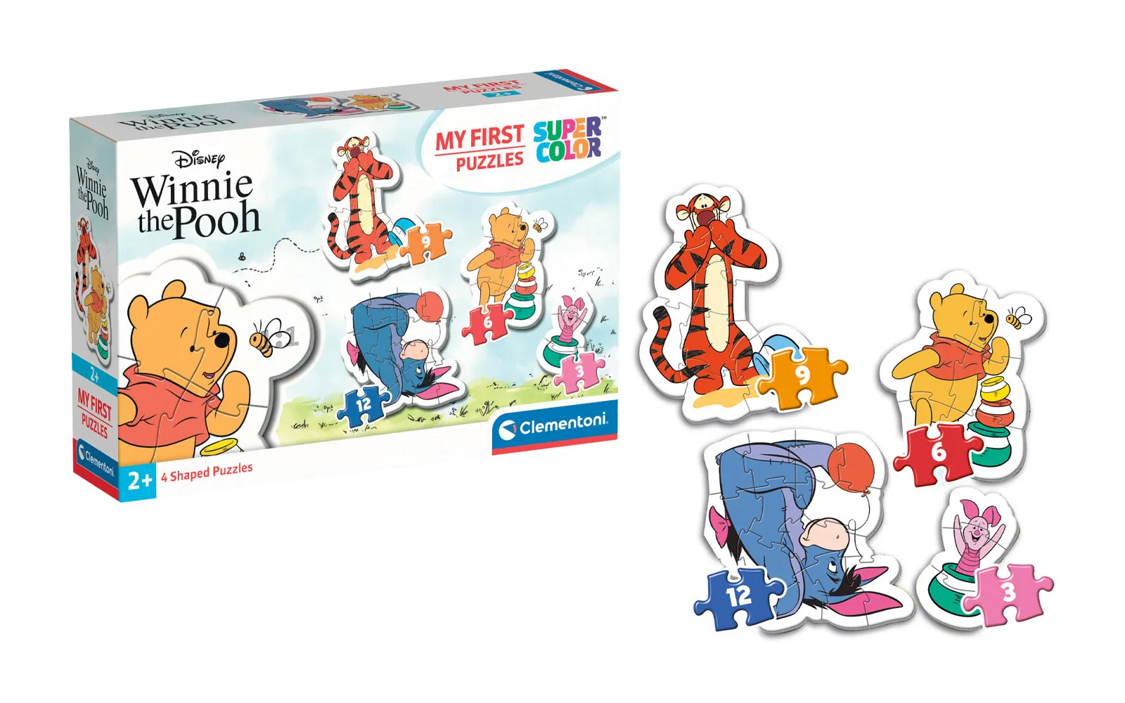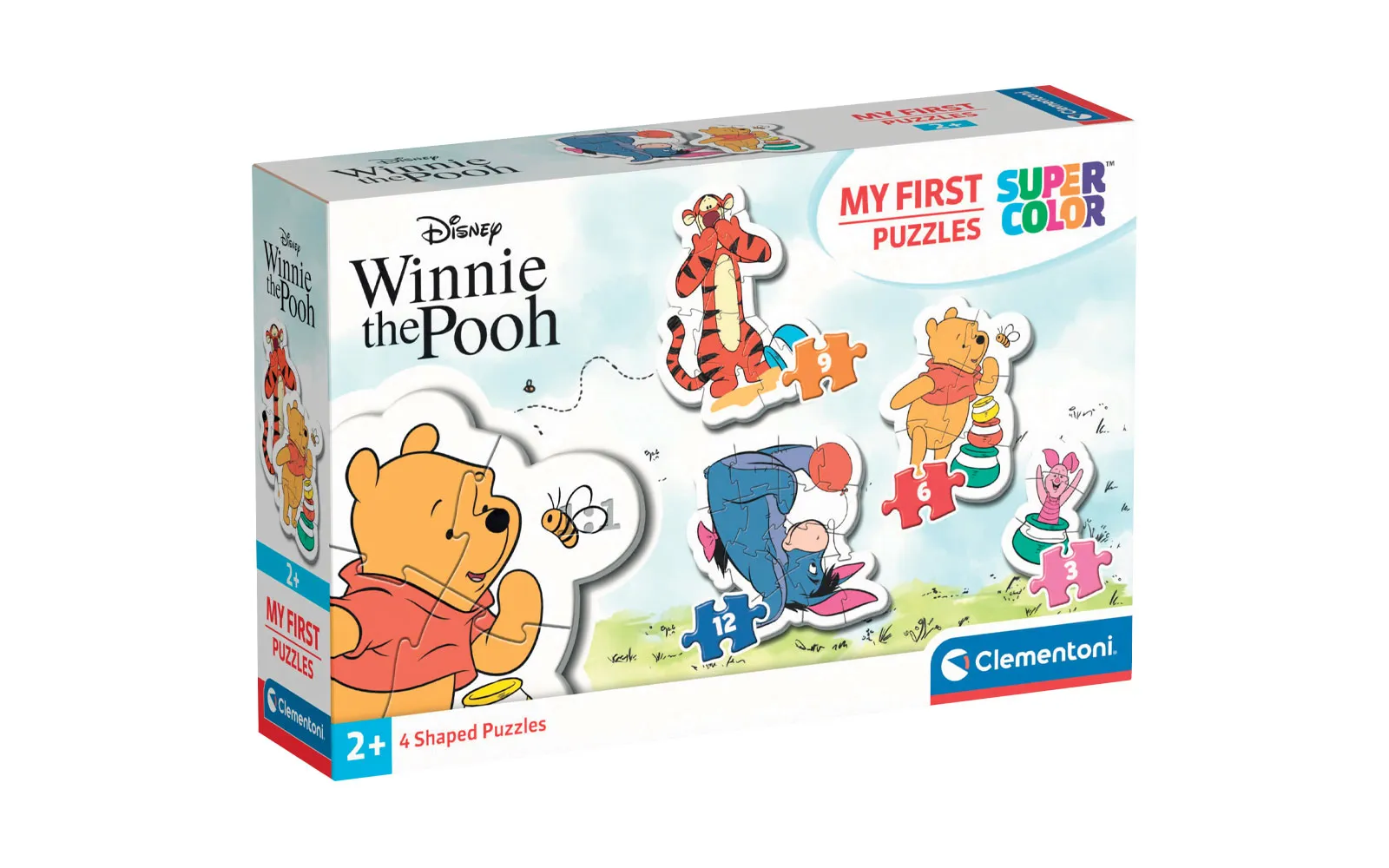 Puzzle baby my first contains simple and cute puzzles for our little ones. Included are 4 separate puzzles that have a different number of parts (from 2 to 12). Puzzles are more than suitable for a child's first puzzle. Available in a Winnie the Pooh theme.