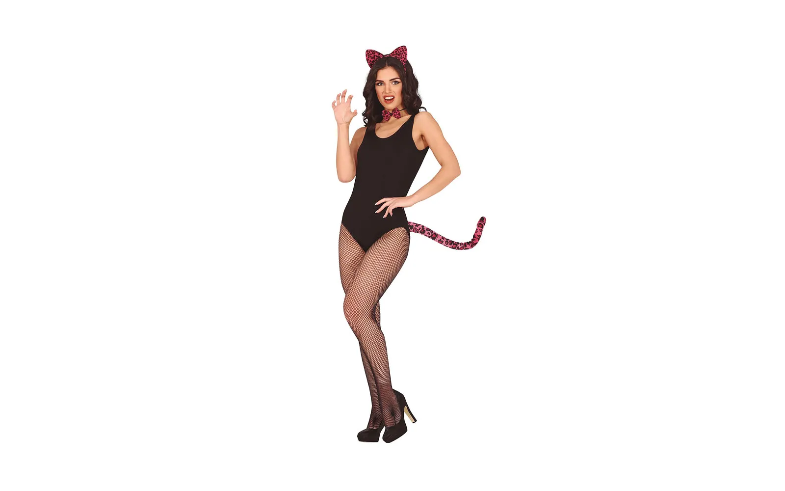 Leopard Carnival headband, pink color + butterfly + tail. Transform into a wild cat with this playful set! It includes a headband with leopard patterned ears, a matching bow for around the neck, and a long tail. The perfect addition to a cat costume for carnivals, themed parties, or stage performances. The set is intended for adults and is sure to attract attention!