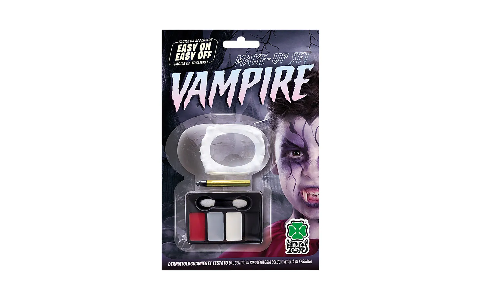 The complete face paint set for a vampire with addition - teeth is the perfect choice for carnival parties, costumes, and scary disguises. The paints are safe, easy to apply, and durable, so your vampire look will stay flawless all night long.