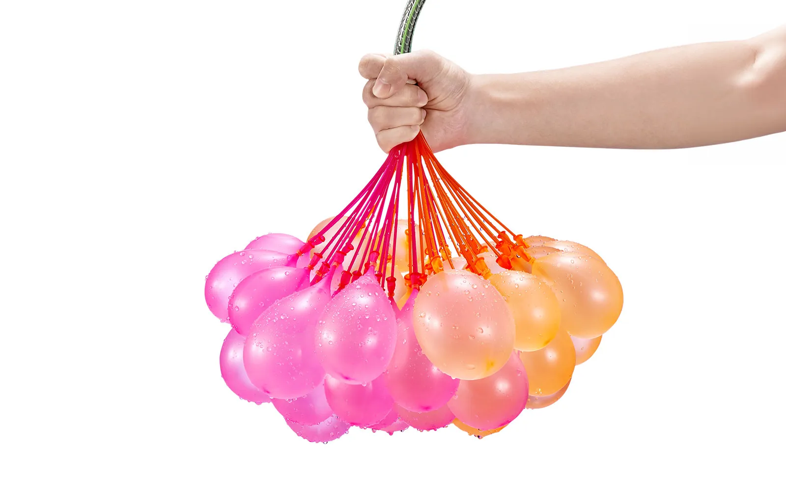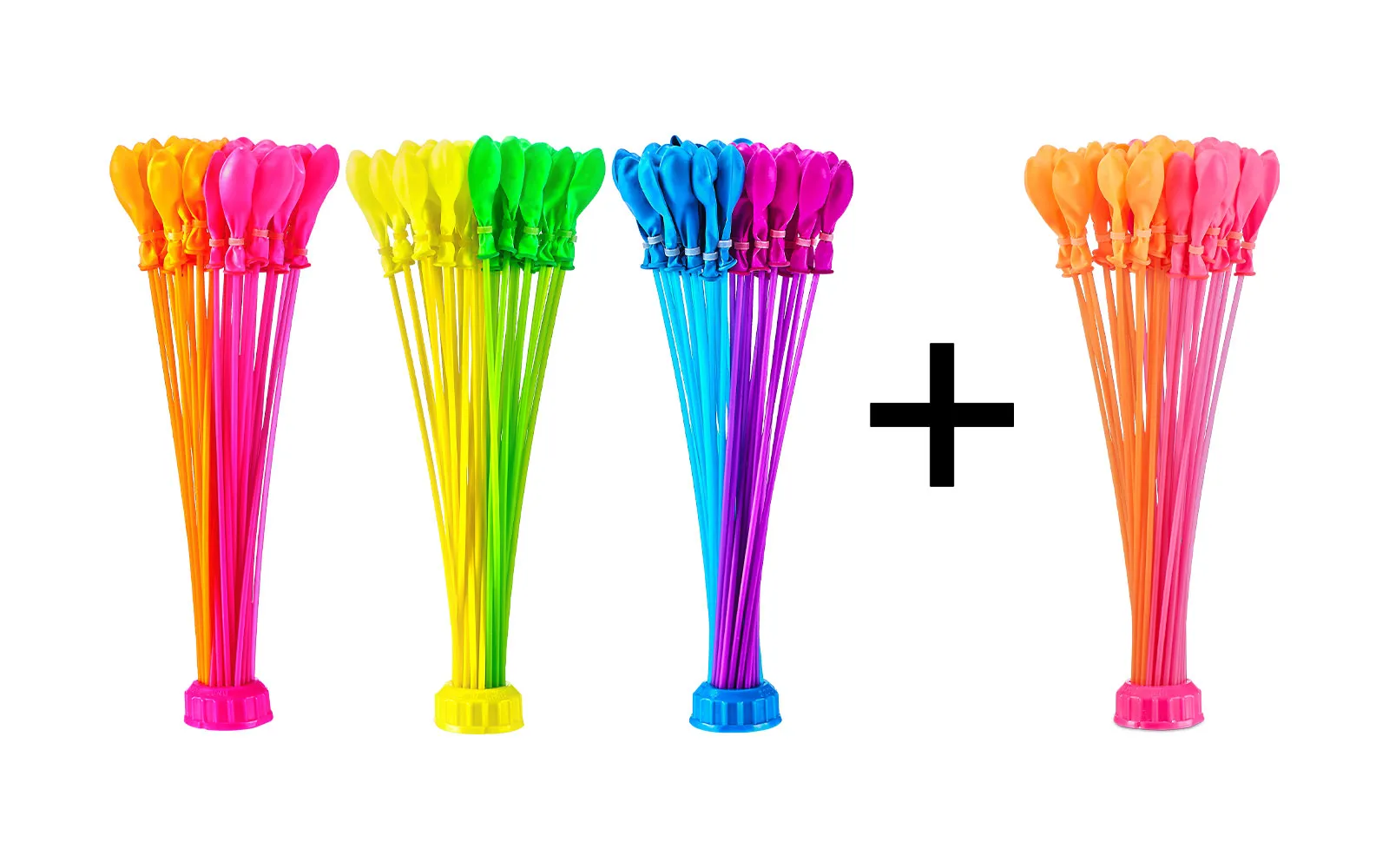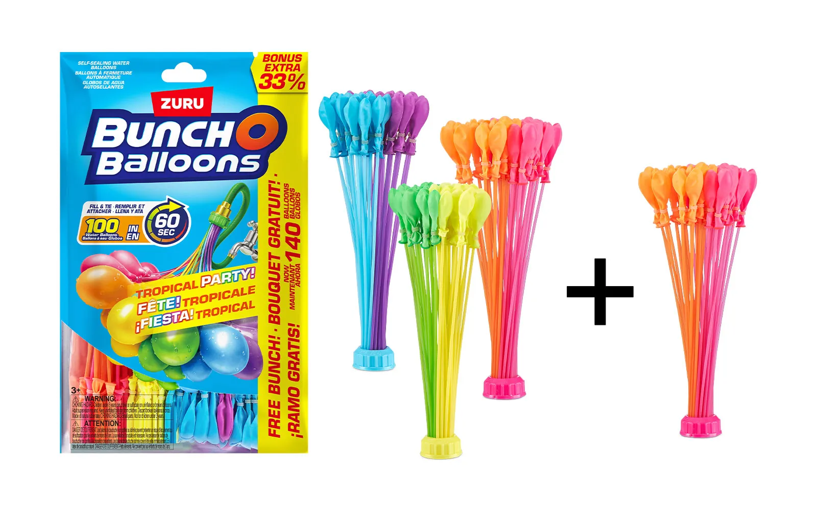 Fill and tie 100 water balloons + 40 pieces free in less than 60 seconds with these sensational self-tying water balloons! The Bunch O Balloons Tropical set contains three bunches of water balloons of different colors, which, when filled with water, tie themselves. There are about 35 water balloons in each bunch.