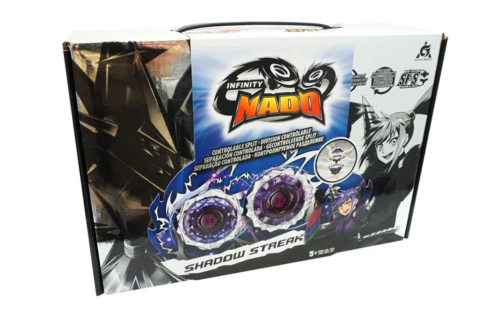 Junaki animirane serije Infinity Nado so tu s setom Nado crack "shadow streak", ki vsebuje zgornjo Nado vrtavko, spodnjo Nado vrtavko pripomoček za razstavljanje, držalo, sprožilec in nazobčano vrvico za izstrelitev. Priporočamo otrokom od 5. leta starosti dalje. Zgornjo in spodnjo Nado vrtavko lahko združite v eno, ki se lahko nato med vrtenjem spet razdružita v dve ločeni vrtavki.