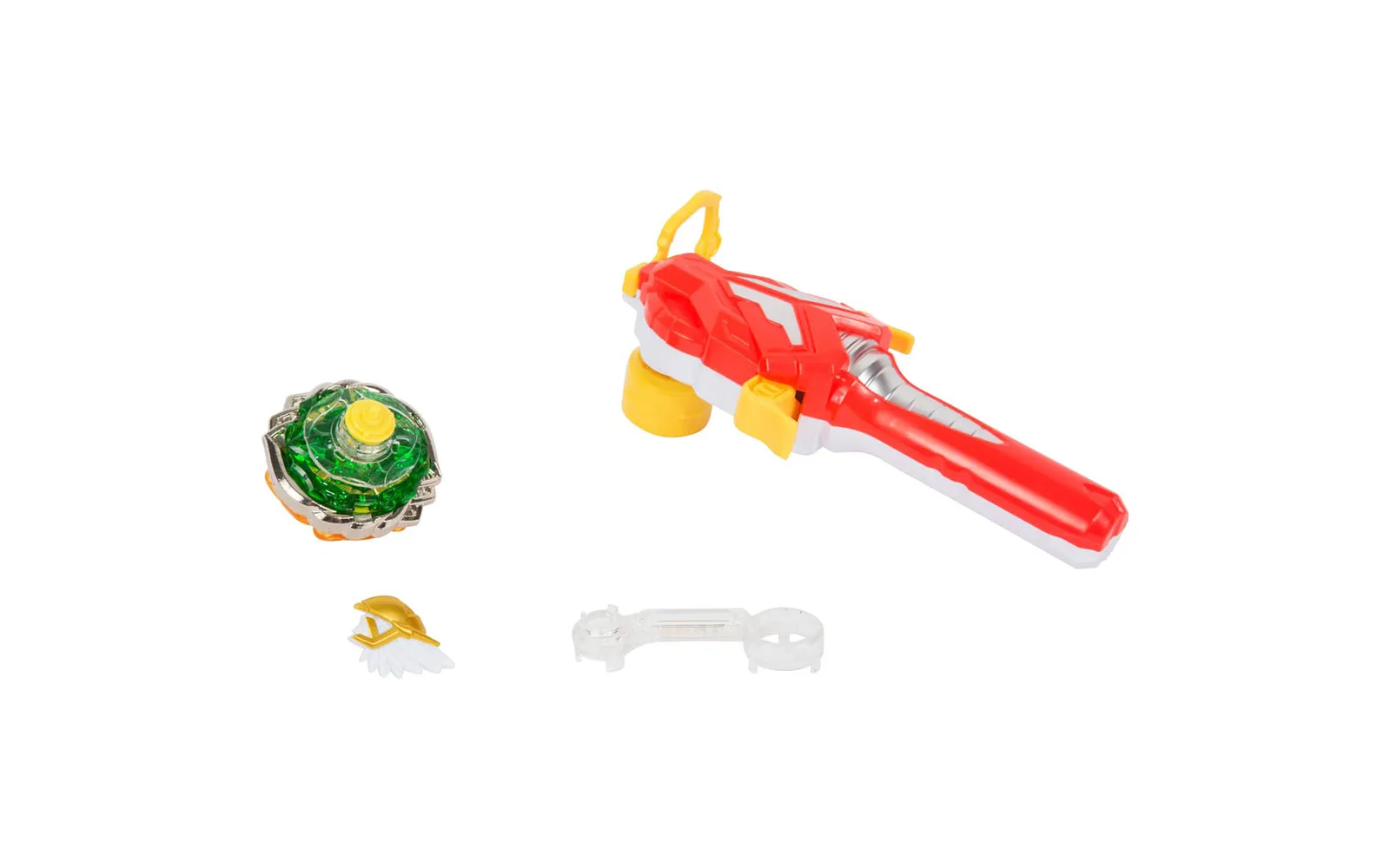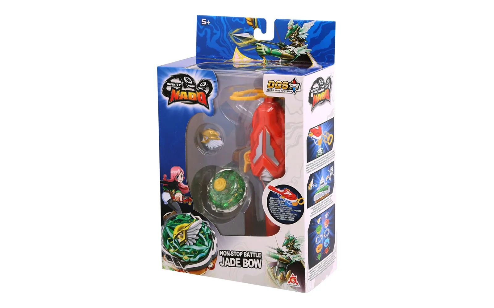 The Infinity Nado 2 Original "Jade bow" set includes a spinning top, a disassembly aid, a trigger with a magnet and a serrated launch cord, recommended for children from the age of 5.