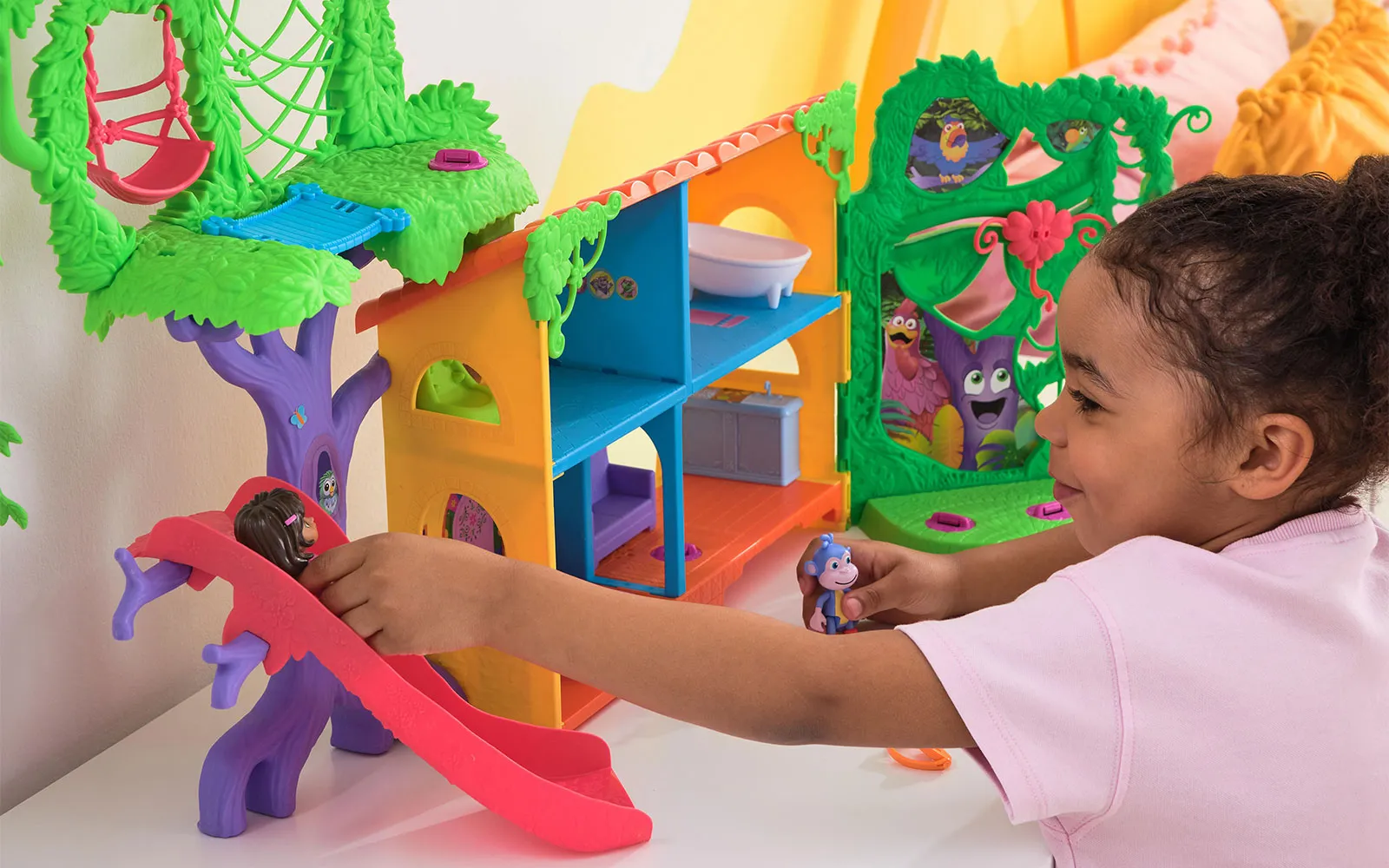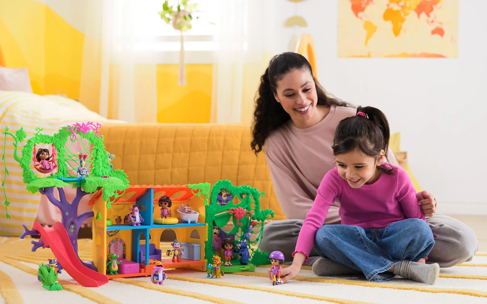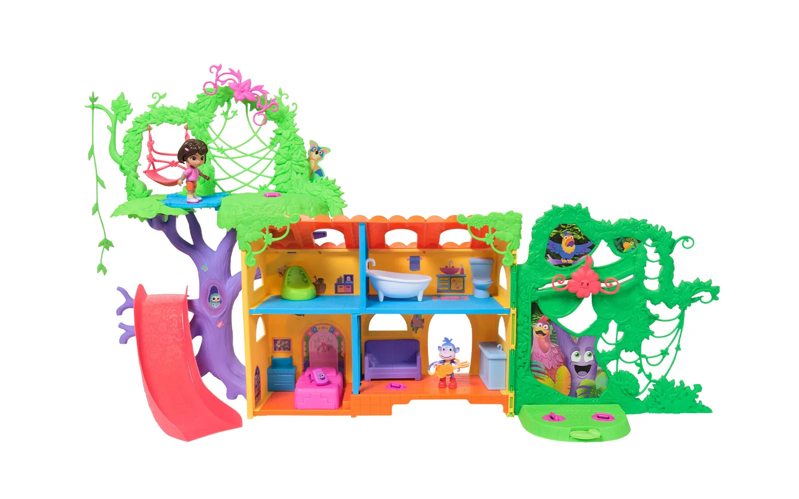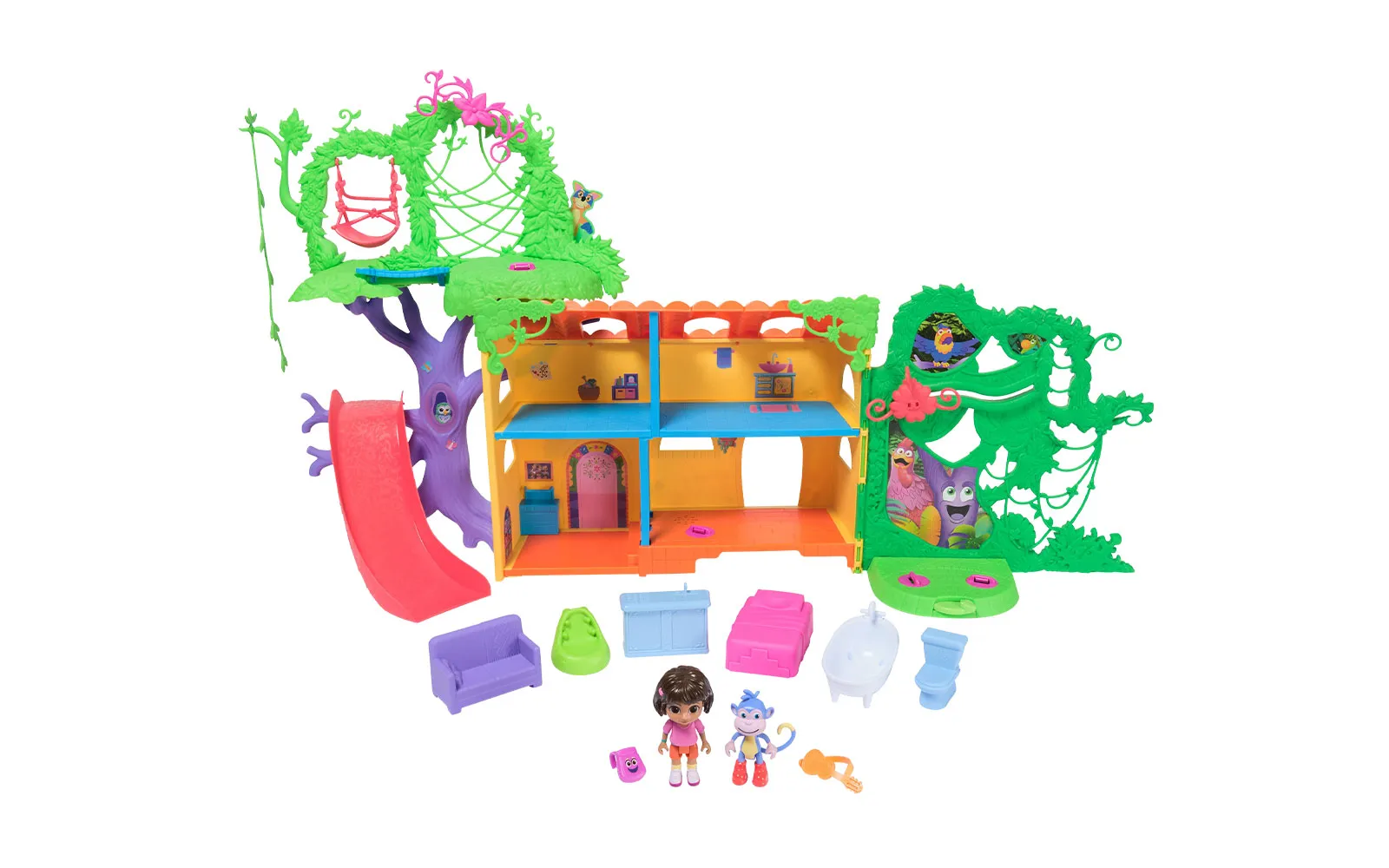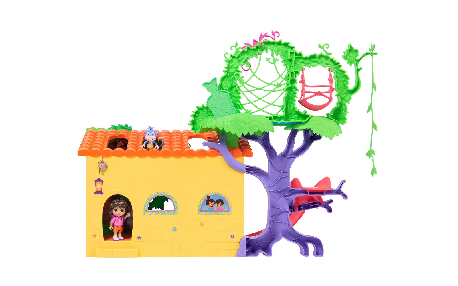 House, set, Dora. The set includes Dora's house, a figurine, various accessories, furniture, a slide, a tree, and more. The house transforms and has a dance floor and slider. The set includes 2 figurines and 8 accessories.