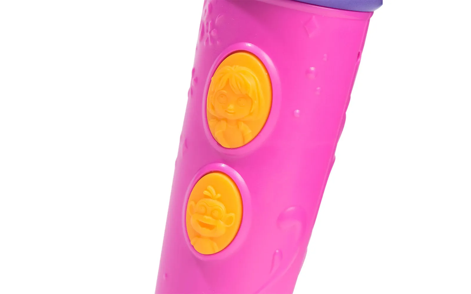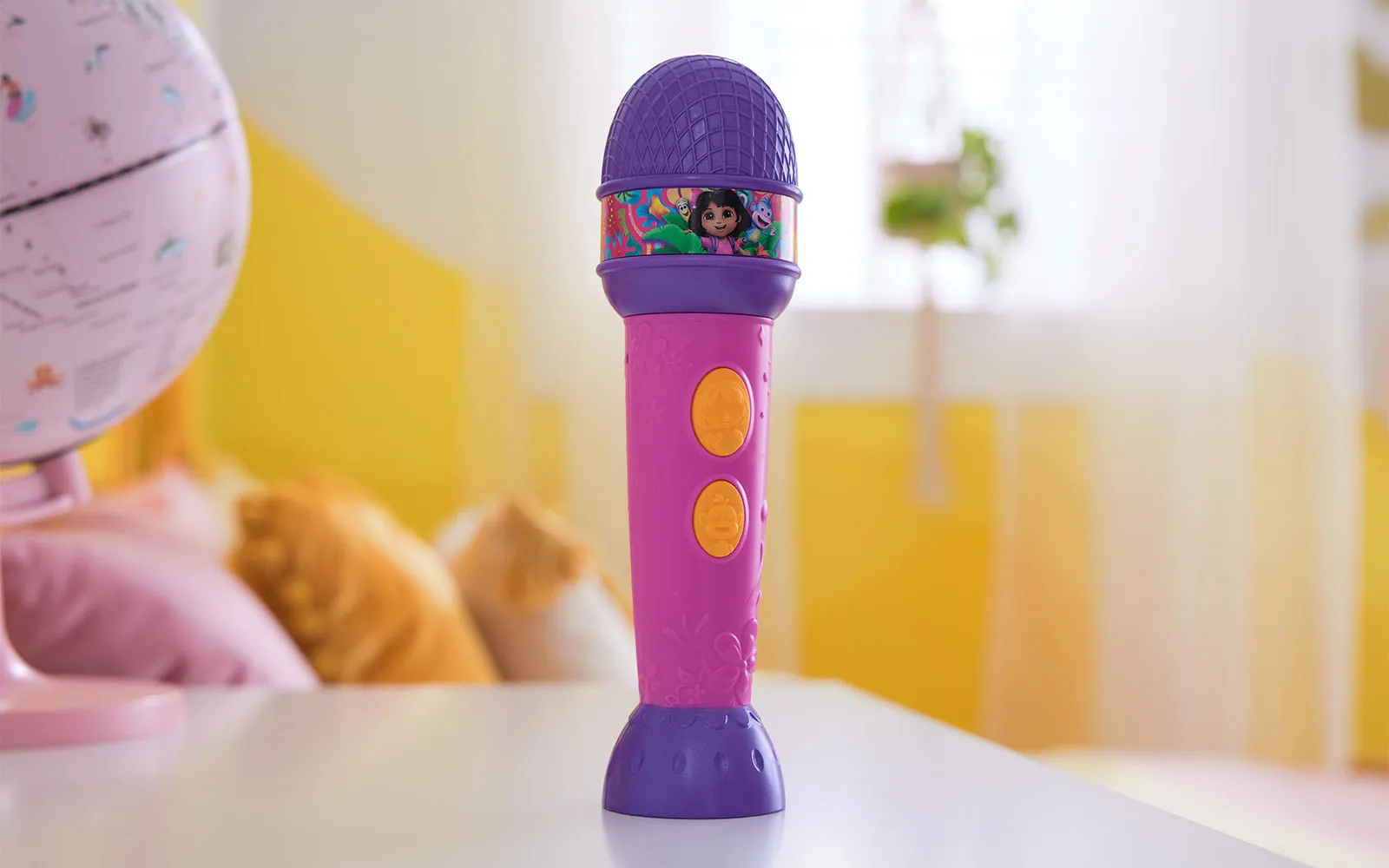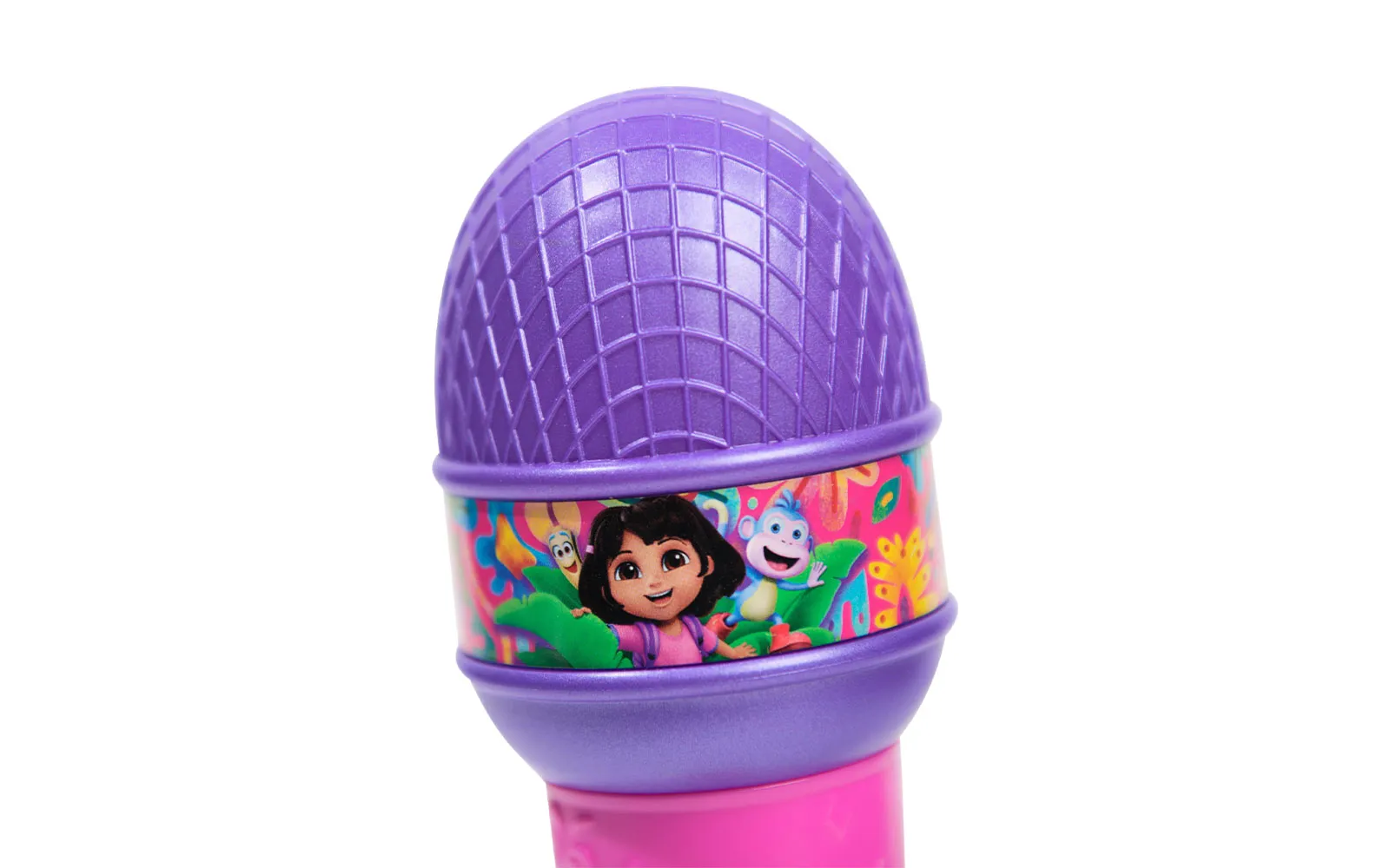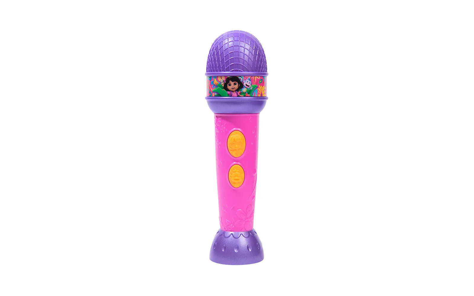 Microphone, Dora. The microphone is suitable for all fans of the animated series Dora, as well as for all music enthusiasts. The microphone is approximately 20 cm in size and has 2 activation buttons and different sounds. Sing into the microphone and shine like a real star!