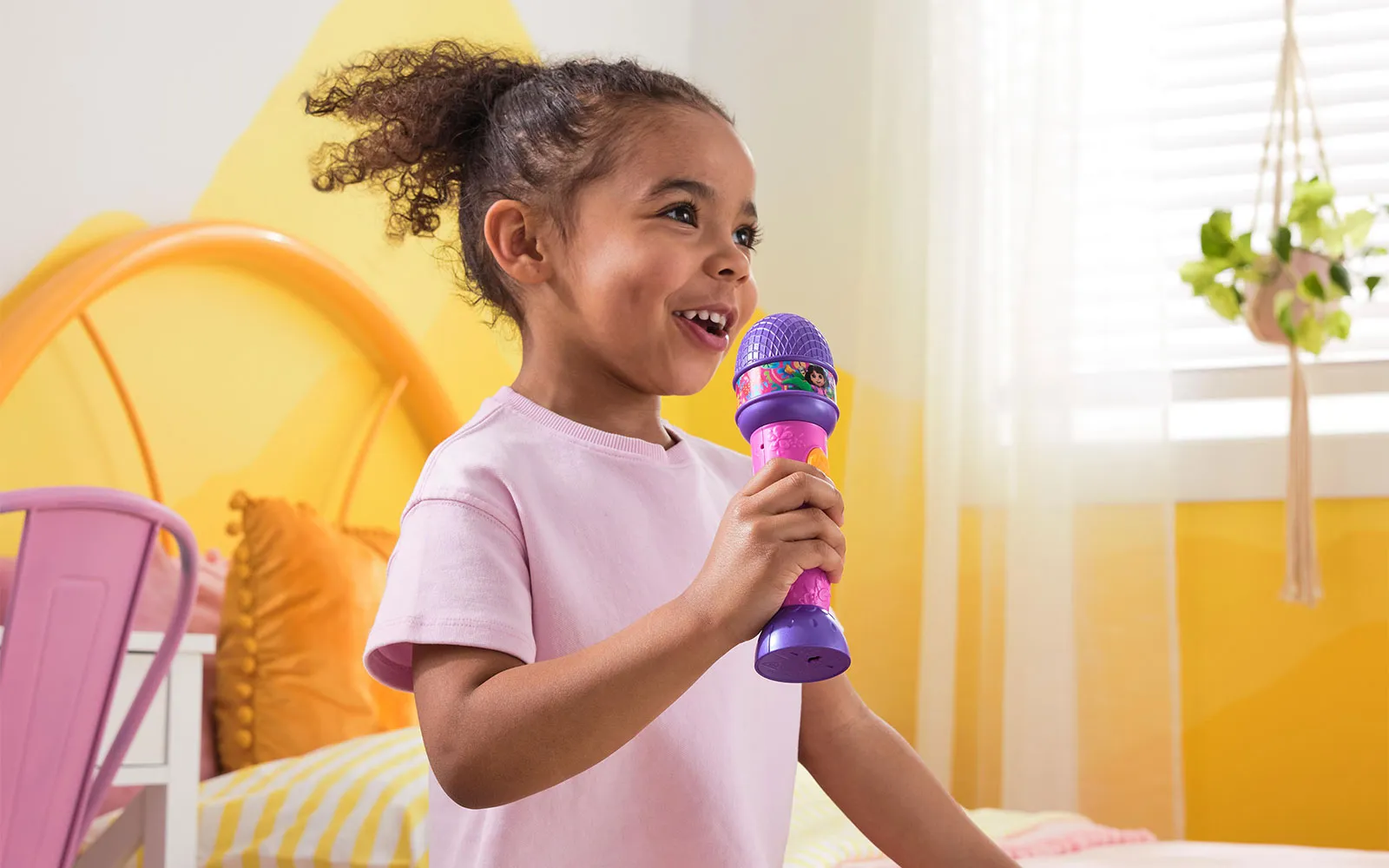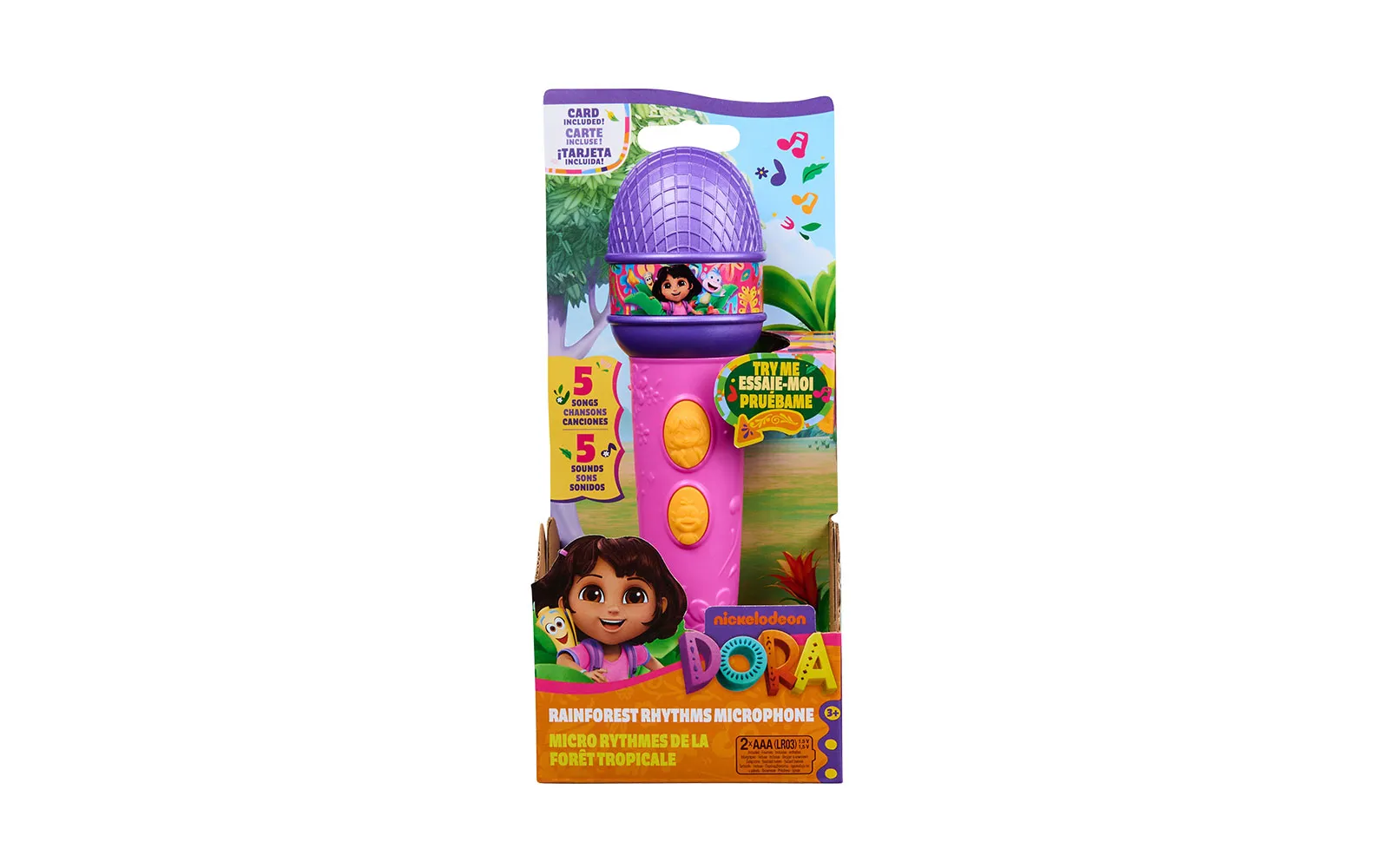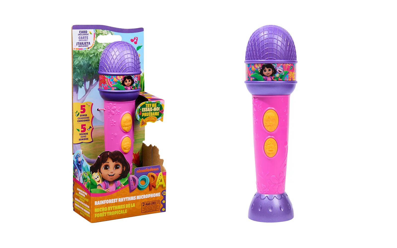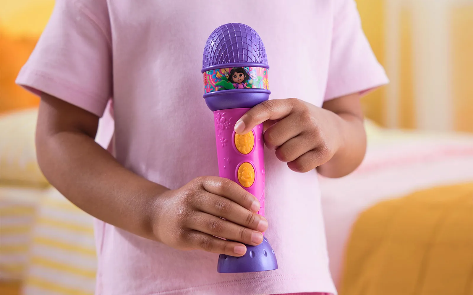 Microphone, Dora. The microphone is suitable for all fans of the animated series Dora, as well as for all music enthusiasts. The microphone is approximately 20 cm in size and has 2 activation buttons and different sounds. Sing into the microphone and shine like a real star!