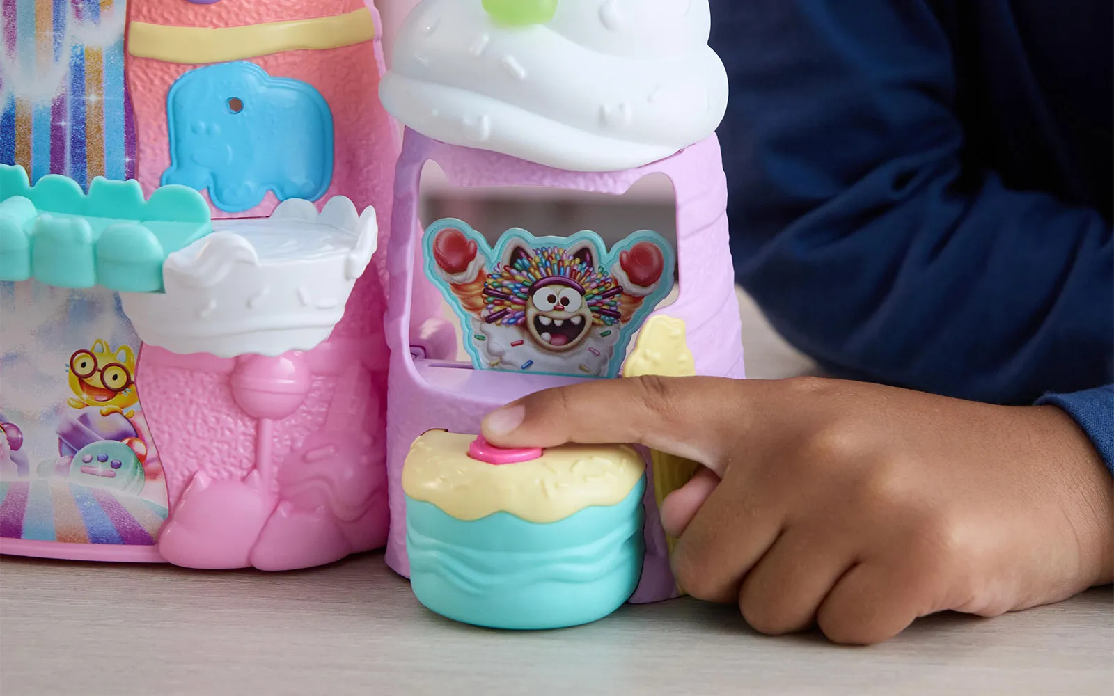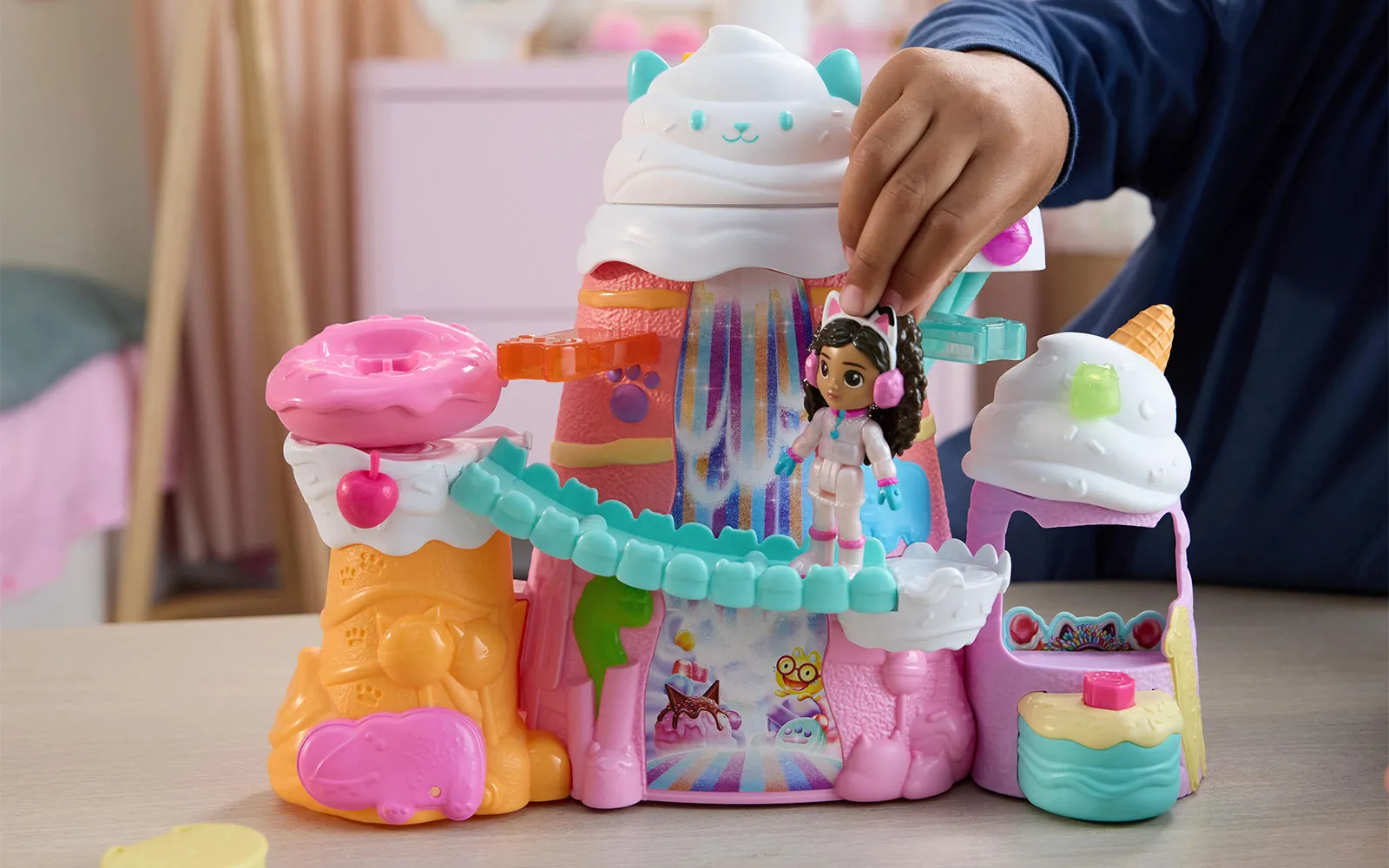The sweet set, Gabby's Dollhouse. The Gabby's Dollhouse Sprinkle Party Sweet Treat Set includes 15 different pieces, including cups, plates, spoons, a tray, sugar, marshmallows, fruit and cream. Children can create sweet fun, fill the cups with hot chocolate, add candies and fruit, and spin the cream to reveal a delicious pastry. The set encourages imagination and role play, enabling the creation of different scenarios.