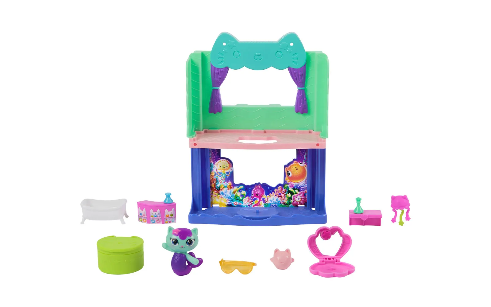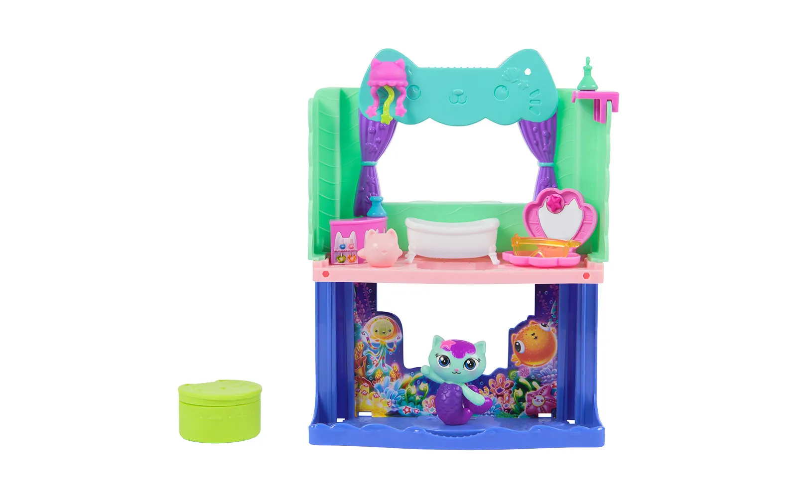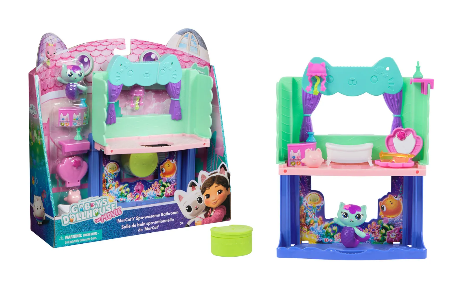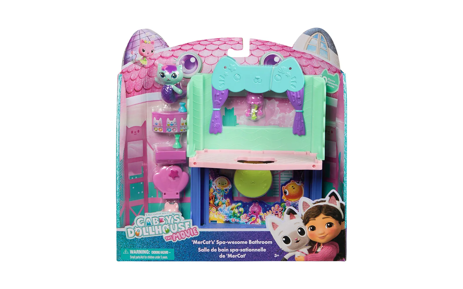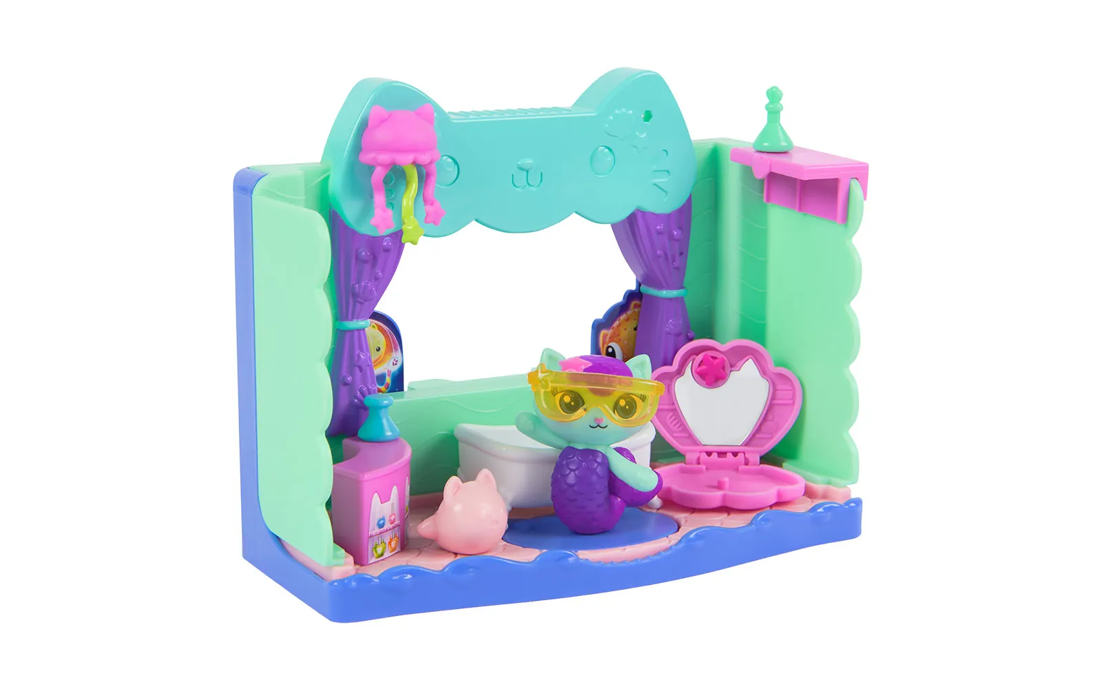 Bathroom movie set, Gabby's dollhouse. The wonderful bathroom includes 1 figure, various pieces of furniture, a mirror, a bathtub, and so on and so forth.