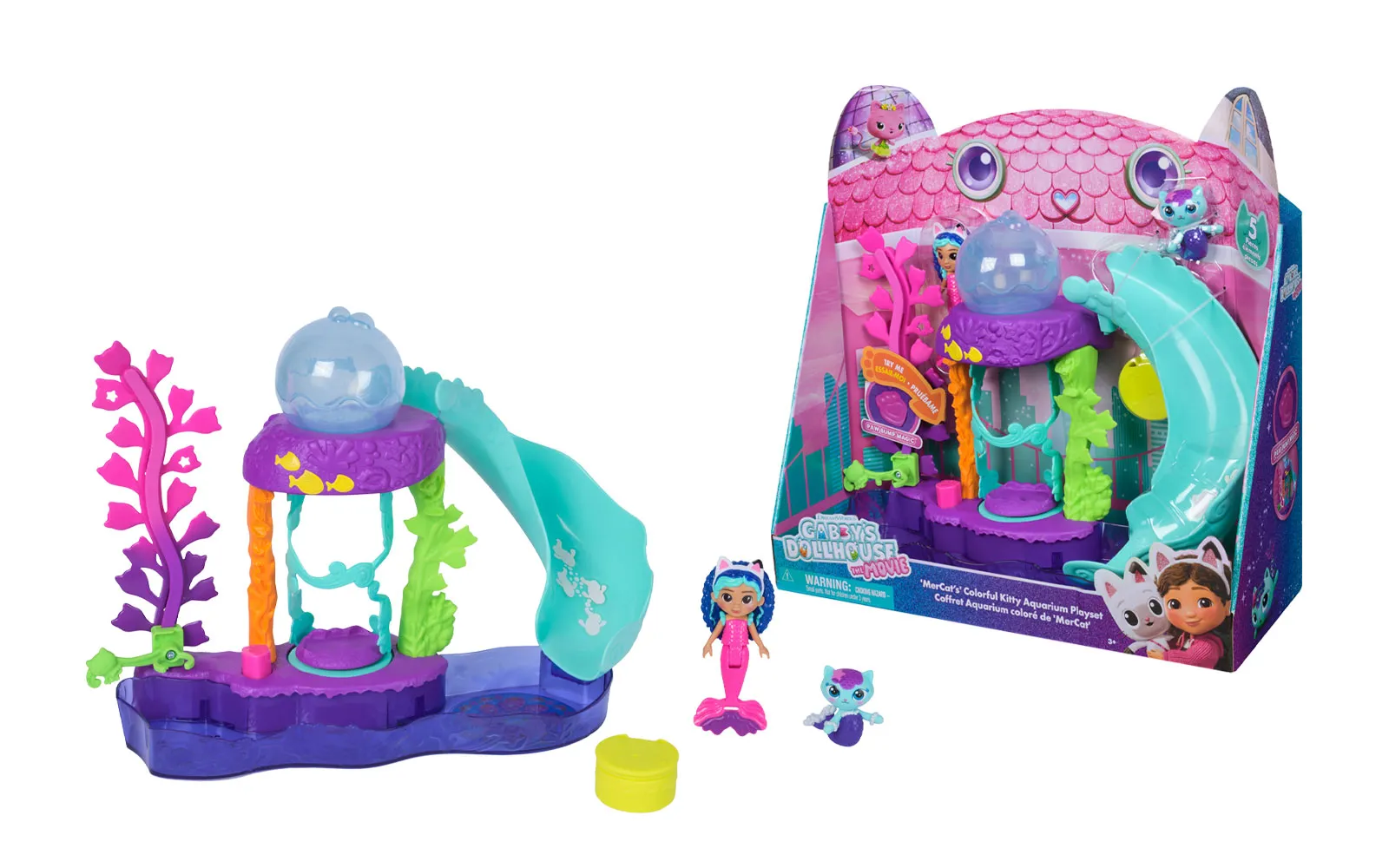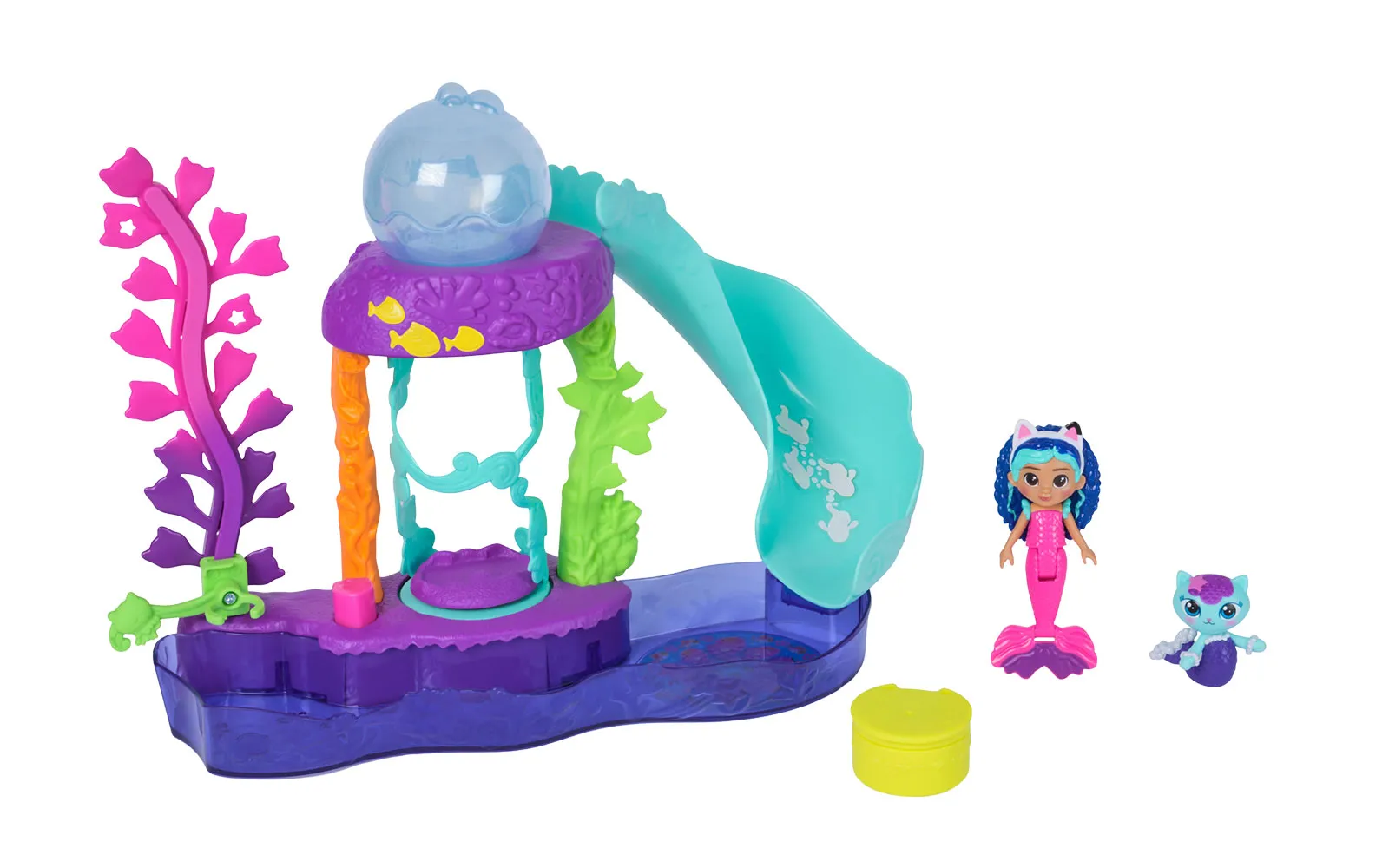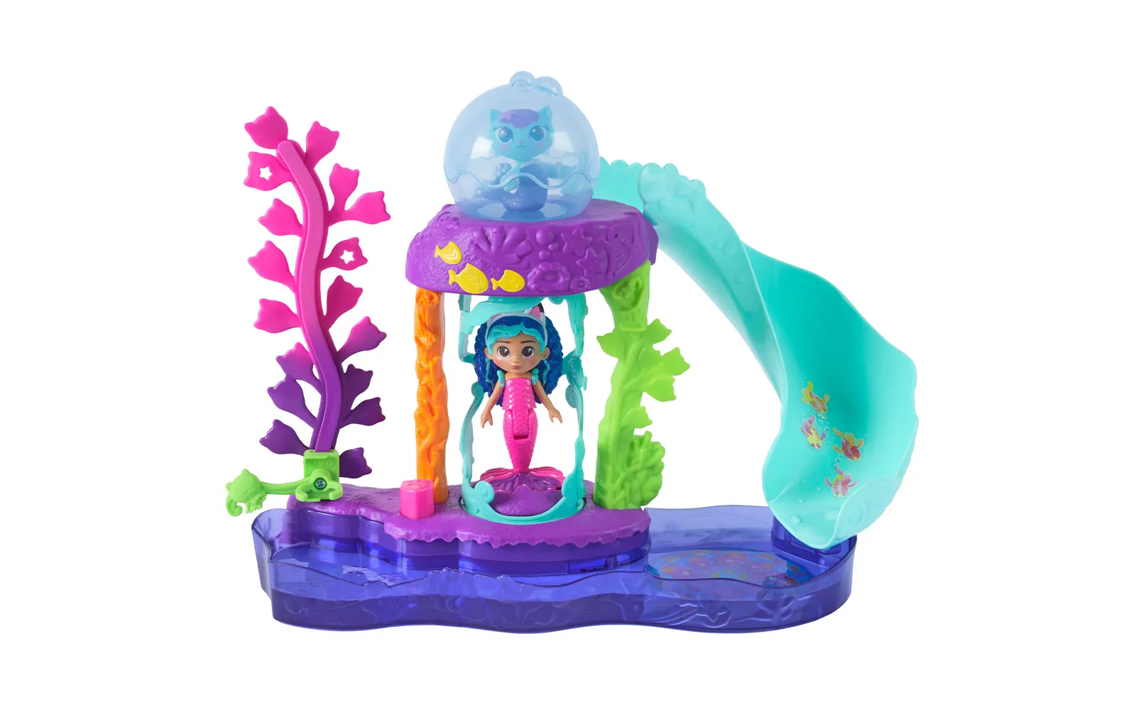 Aquarium movie set, Gabby's Dollhouse. The set includes various figurines, a slide, a fish, water trees, and much more. Let your figure slide down the slide and have fun!