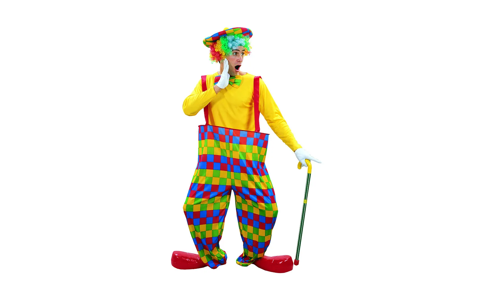Zabavaj se, nasmej ljudi s pustnim kostumom klovn za odrasle, ki vsebuje hlače, klobuk in pentljo. Majica, rokavice, palica in čevlji niso priloženi. Velikost je univerzalna. Sestava: 100% POLIESTER