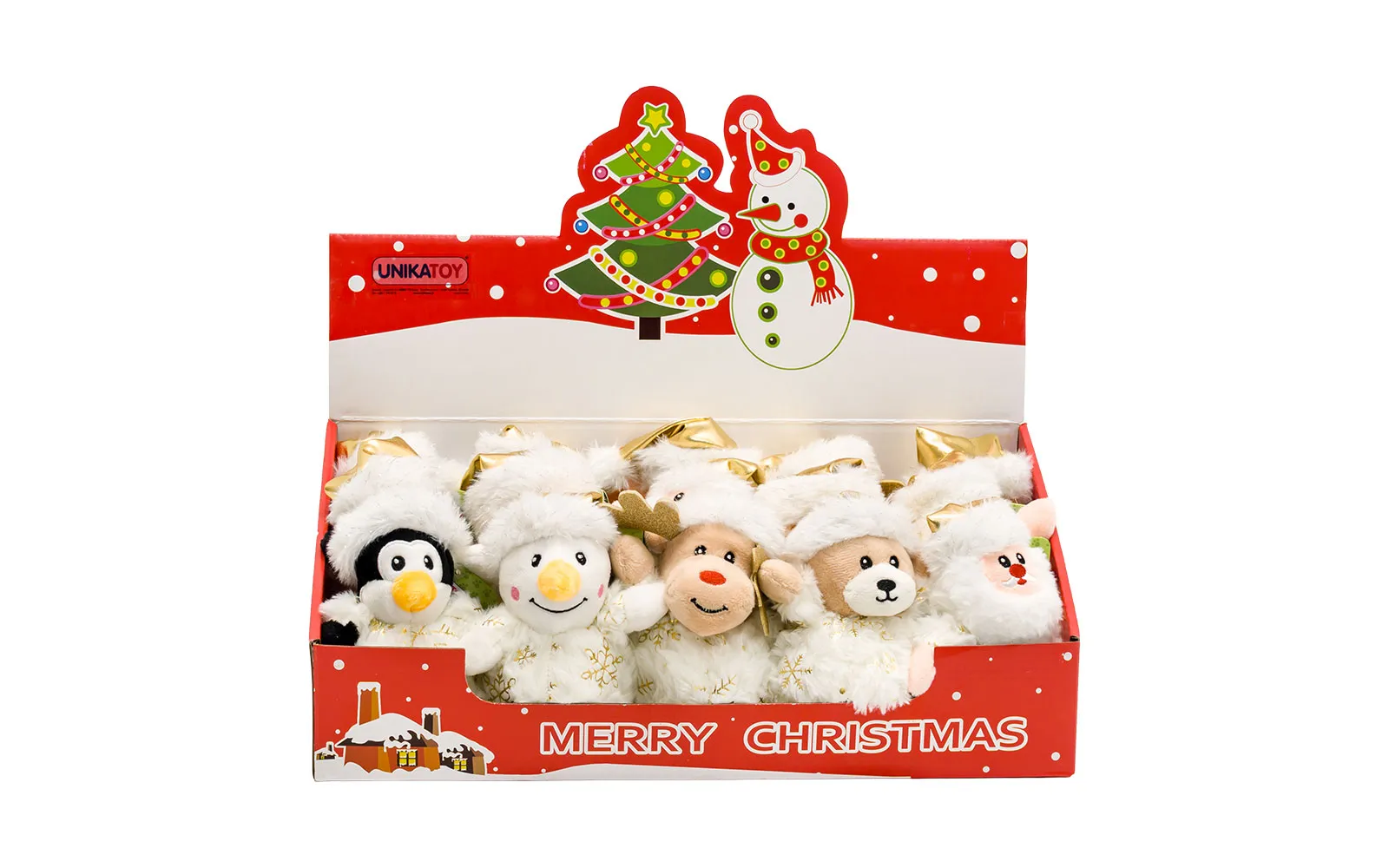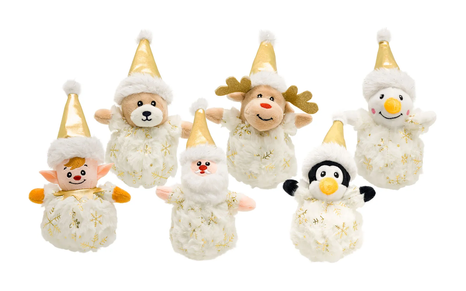 The plush Christmas figurines are 12 centimeters in size and white in color. They have warm hats and wonderful gold details that give them a festive glow. They are exceptionally soft to the touch, making them perfect companions for winter days and a wonderful decoration for your home! Available in various styles - teddy bear, reindeer, snowman, Santa Claus, penguin and elf.