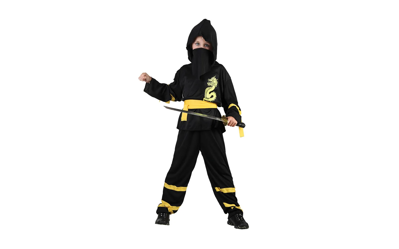 Hide in the shadows and show off your ninja skills with this ninja children's costume! It includes a jumpsuit with a hood and belt, and details that create the appearance of a real warrior. It is perfect for carnival, birthday parties, or role-playing games. Comfortable to wear and move in.