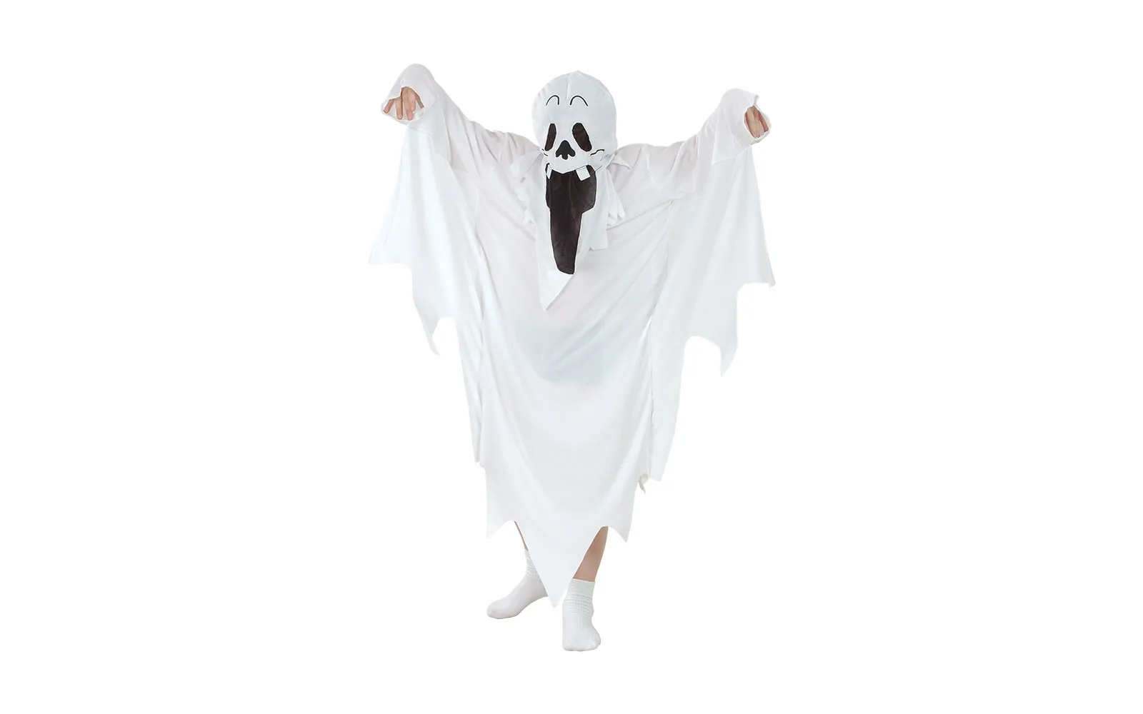 A scary but cute ghost costume that will impress at any carnival or night party! It includes a long white dress and a hood with distinctive mouth and eyes. Socks are not included in the set. A classic choice for Halloween, Mardi Gras, or imaginative play. Comfortable and easy to dress up.