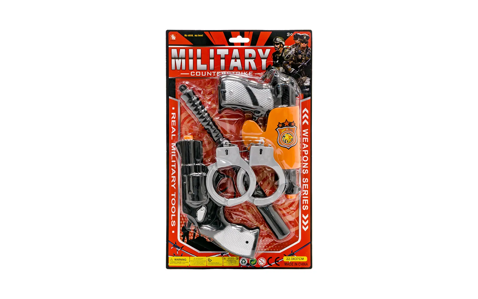 A set of various police equipment among which are two pistols, handcuffs, baton, and more.