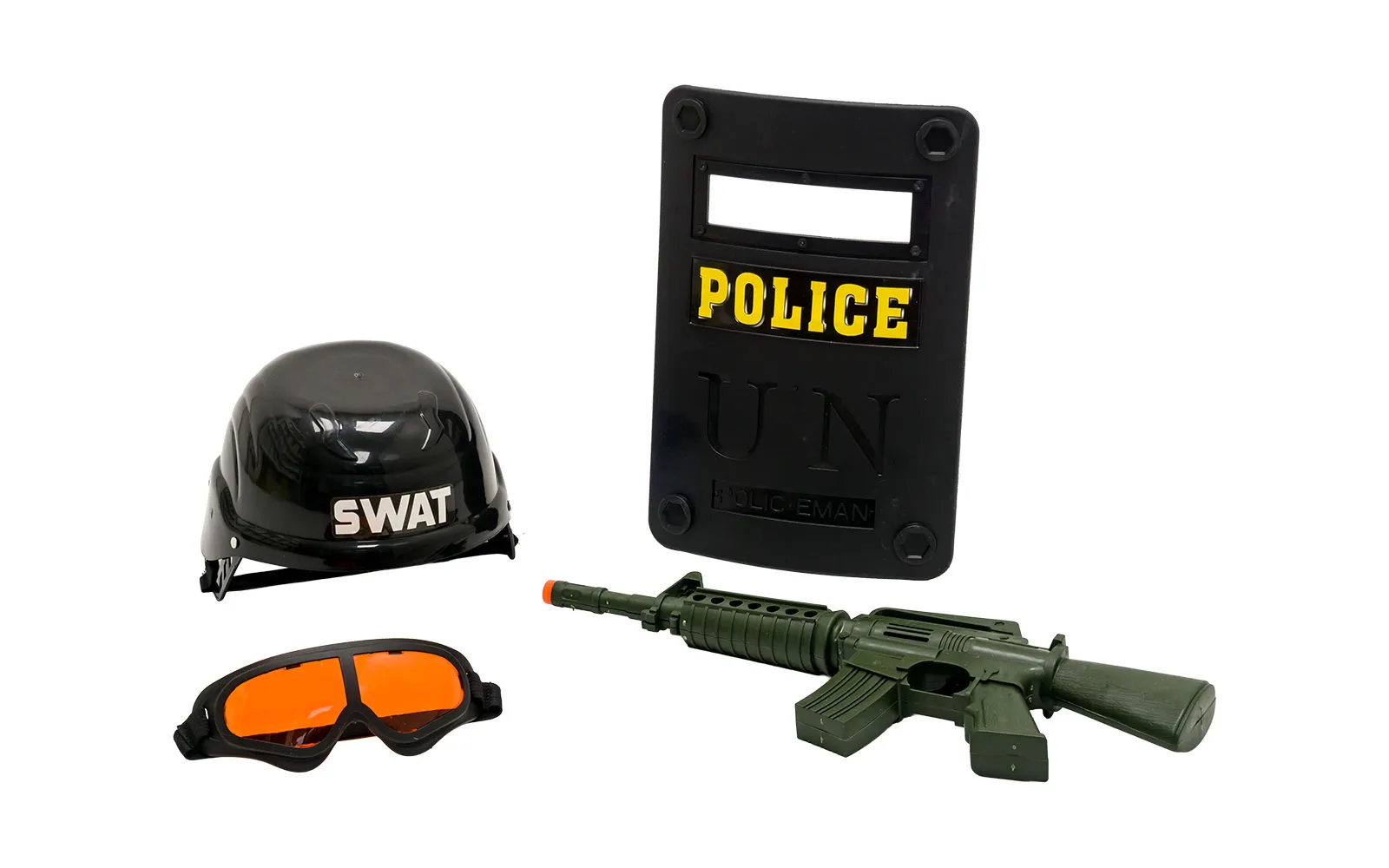 Feel like a real policeman with excellent police accessories. The carnival police set with a helmet is perfect for children who want to become policemen for carnival. The set includes armor, rifle, helmet, and other police accessories.
