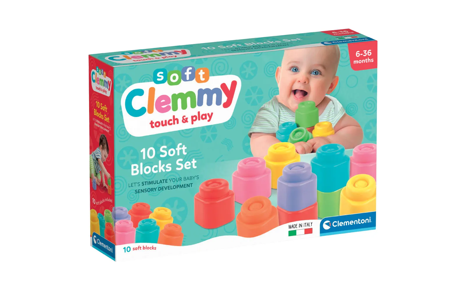 Clemmy soft blocks, 10 pieces, Clementoni. The package includes 10 soft Baby Clemmy blocks. Washable and non-toxic Clemmy blocks are designed to provide completely safe play for the youngest. Lots of bright colors that stimulate visual perception, attention and observation skills.