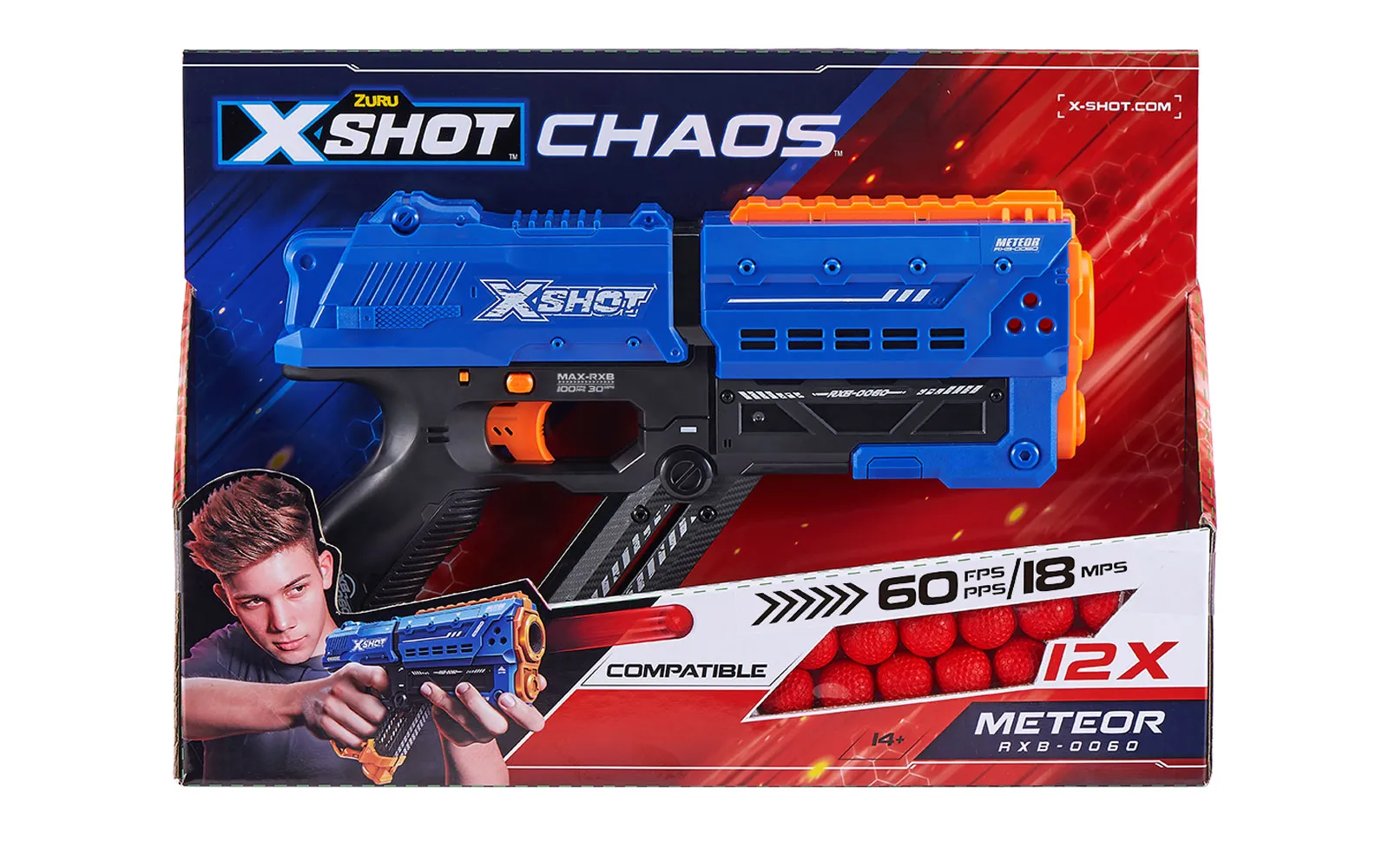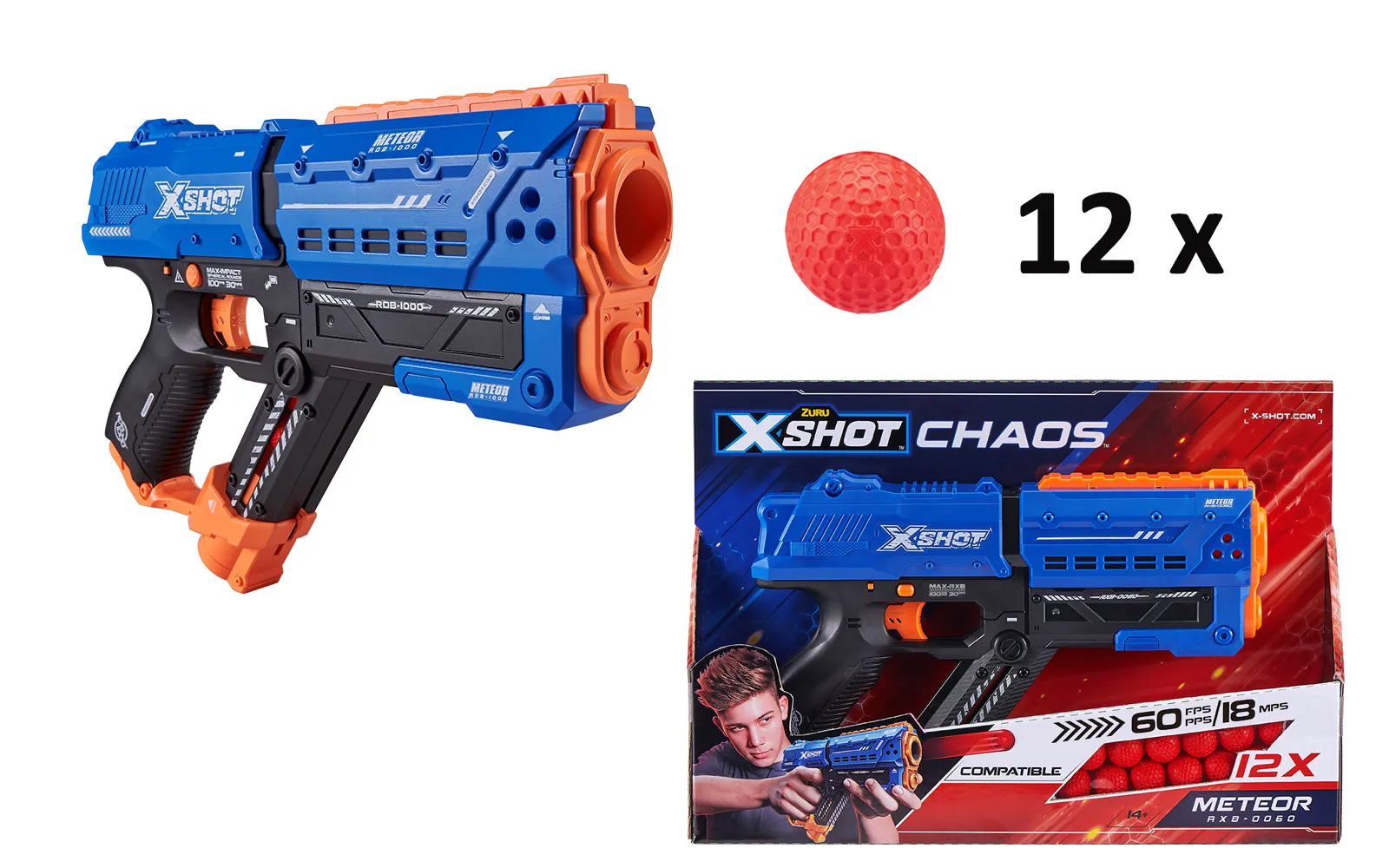 Load, aim, and jump into action. The remarkable charging mechanism will ensure that you never run into any trouble. The meteor projectile travels as far as 30m in one second, which means trouble for your enemies. The set includes an X-shot chaos meteor pistol measuring approximately 32 cm in a combination of black, blue and orange, as well as 12 round projectiles. Load the pistol and let the action begin. This gun does not require batteries for operation. Recommended for children 14 years of age and older.