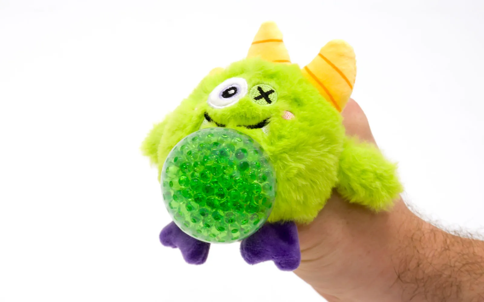 Plush Monster Squizi, a Unikatoy with a frightening look and balls inside his belly. The figurine is made of soft material, and the belly is stretchable. Available in different colors and styles: green, purple, orange or yellow.